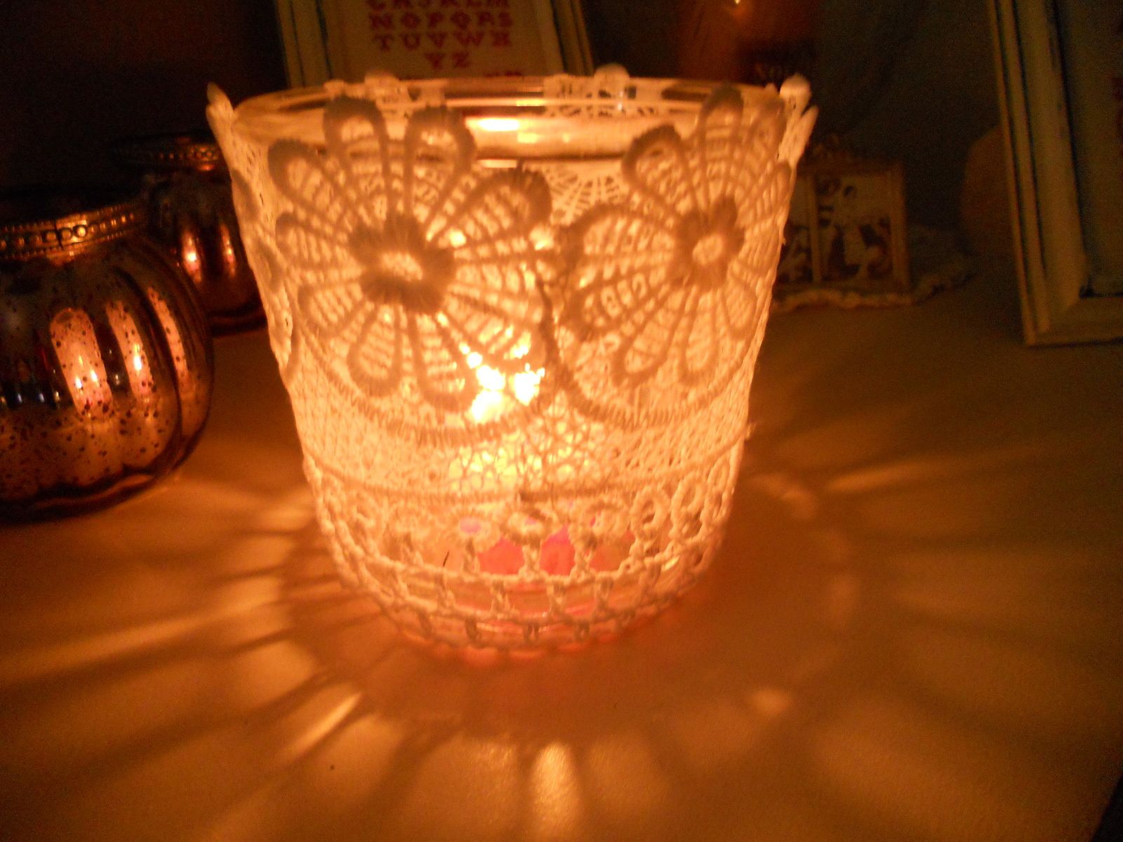 je vous envoie un peu de lumière enveloppée dans ce cache pot de dentelle, que j'ai trouvé sur une étagère dans un petit recoin de MDM..;