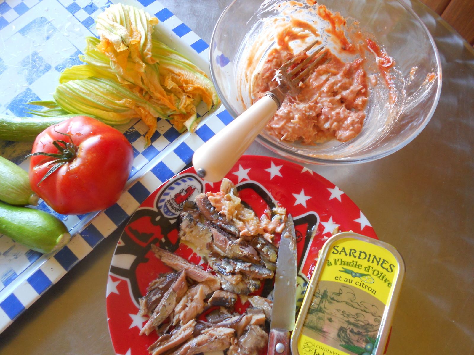 Déposer la tomate sur le fond du plat, farcir les fleurs avec le mélange de fromage frais et sardines, les mettre sur les tomates