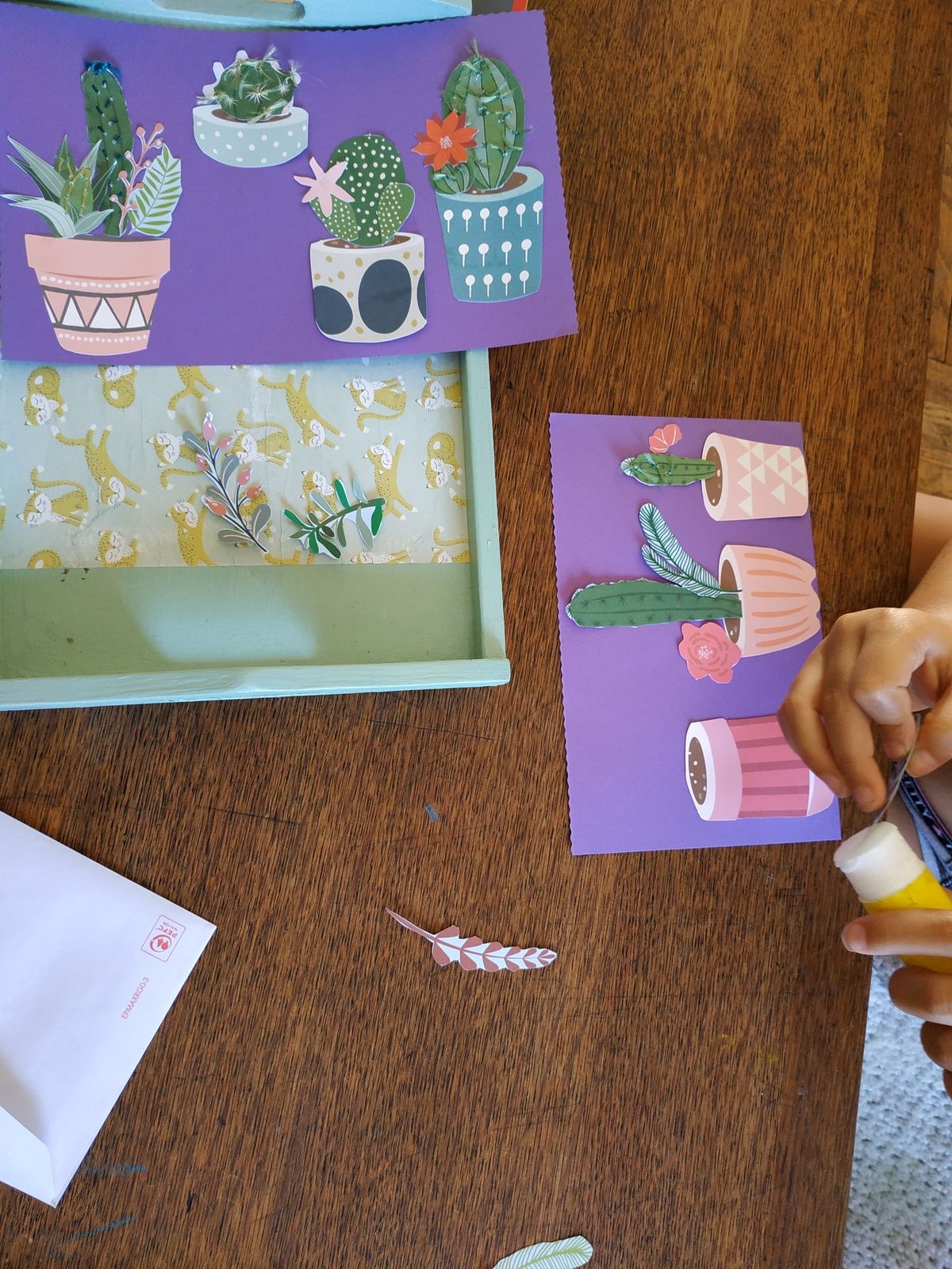 et chacune à coller ses pots et plantes sur un fond de papier violet (qu'elle a choisi)